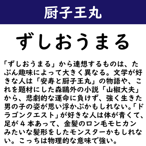 「ずしおうまる」から連想するものは、たぶん趣味によって大きく異なる。文学が好きな人は「安寿と厨子王丸」の物語や、これを題材にした森鷗外の小説「山椒大夫」から、悲劇的な運命に負けず、強く生きた男の子の姿が思い浮かぶかもしれない。「ドラゴンクエスト」が好きな人は体が青くて、足が4本あって、金髪のロン毛モヒカンみたいな髪形をしたモンスターかもしれない。こっちは物理的な意味で強い。