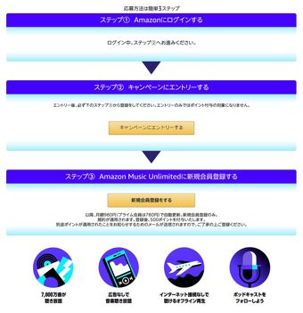 500ポイントの獲得方法は、3ステップだけ。初めにAmazon.co.jpにログインした状態で特設ページにアクセスします。次に「キャンペーンにエントリーする」ボタンを押し、ステップ3の「新規会員登録をする」ボタンからAmazon Music Unlimitedに登録して完了です。