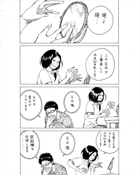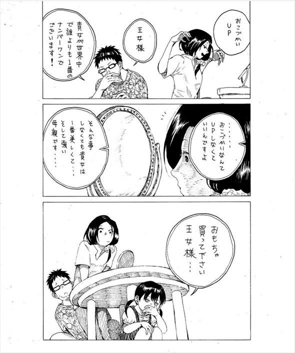 白雪姫でおなじみの「鏡よ鏡……」のセリフを鏡に問いかける女性。彼女の夫と娘の反応は――? 仲良しな一家を描いた漫画に和む人が続出しています。作者は漫画家の江戸川治(@edoosam)さん。