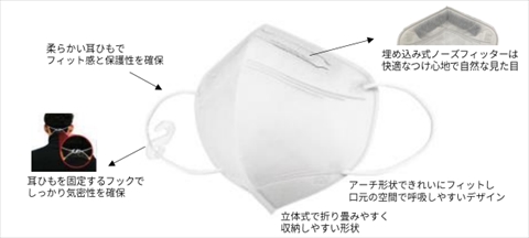アーチ形状と鼻の上の隙間を防ぐノーズフォーム、周囲を密着させるフック付きの耳ひもでフィット性が高く、柔らかいインナー素材や耳ひも、埋め込み式のノーズフィッターで快適な付け心地を実現したとしています。