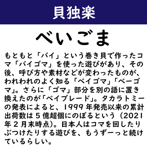もともと「バイ」という巻き貝で作ったコマ「バイゴマ」を使った遊びがあり、その後、呼び方や素材などが変わったものが、われわれのよく知る「ベイゴマ」「ベーゴマ」。さらに「ゴマ」部分を別の語に置き換えたのが「ベイブレード」。タカラトミーの発表によると、1999年発売以来の累計出荷数は5億超個にのぼるという(2021年2月末時点)。日本人はコマを回したりぶつけたりする遊びを、もうずーっと続けているらしい。