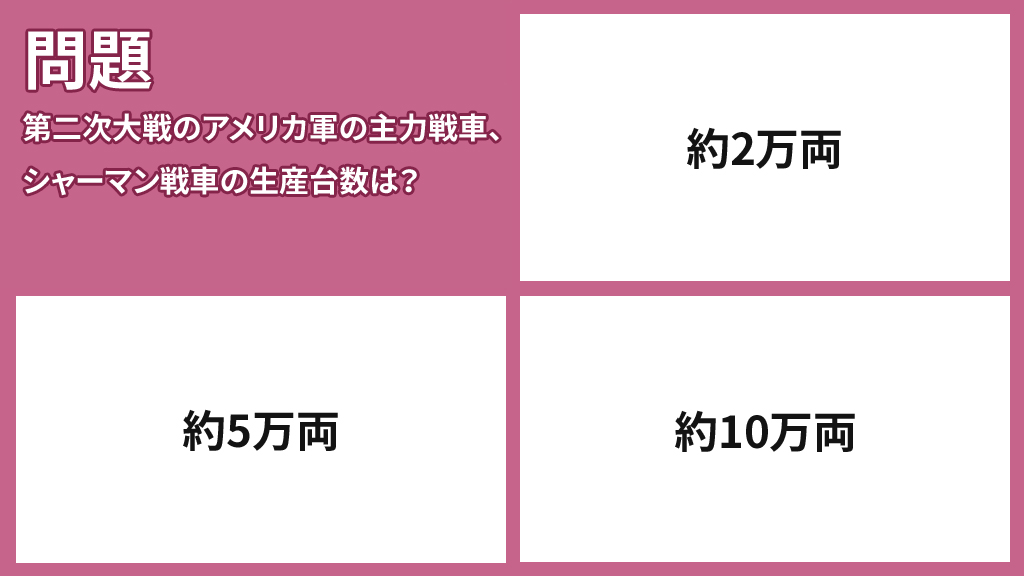 問題:第二次大戦のアメリカ軍の主力戦車、シャーマン戦車の生産台数は?