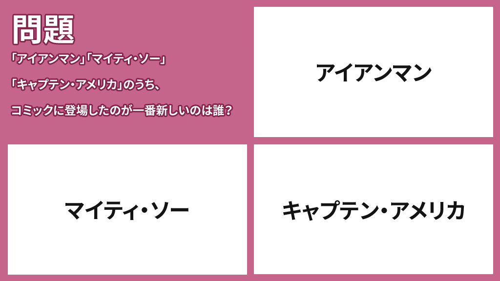 問題:「アイアンマン」「マイティ・ソー」「キャプテン・アメリカ」のうち、コミックに登場したのが一番新しいのは誰?