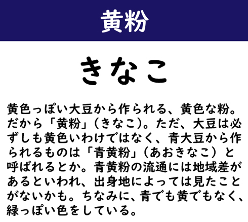 黄色っぽい大豆から作られる、黄色な粉。だから「黄粉」(きなこ)。ただ、大豆は必ずしも黄色いわけではなく、青大豆から作られるものは「青黄粉」(あおきなこ)と呼ばれるとか。青黄粉の流通には地域差があるといわれ、出身地によっては見たことがないかも。ちなみに、青でも黄でもなく、緑っぽい色をしている。