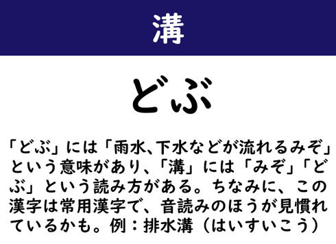 「どぶ」には「雨水、下水などが流れるみぞ」という意味があり、「溝」には「みぞ」「どぶ」という読み方がある。ちなみに、この漢字は常用漢字で、音読みのほうが見慣れているかも。例:排水溝(はいすいこう)