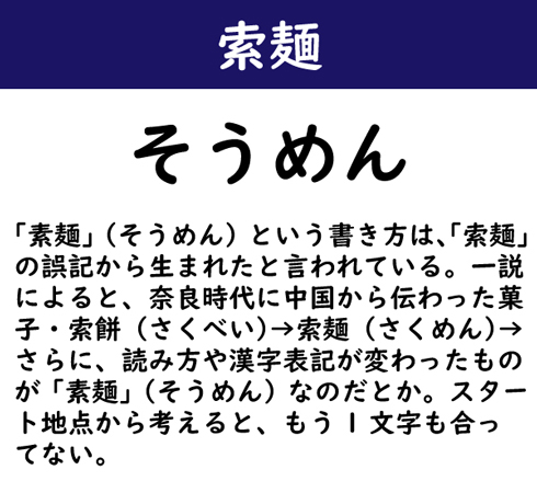 「素麺」(そうめん)という書き方は、「索麺」の誤記から生まれたと言われている。一説によると、奈良時代に中国から伝わった菓子・索餅(さくべい)→索麺(さくめん)→さらに、読み方や漢字表記が変わったものが「素麺」(そうめん)なのだとか。スタート地点から考えると、もう1文字も合ってない。