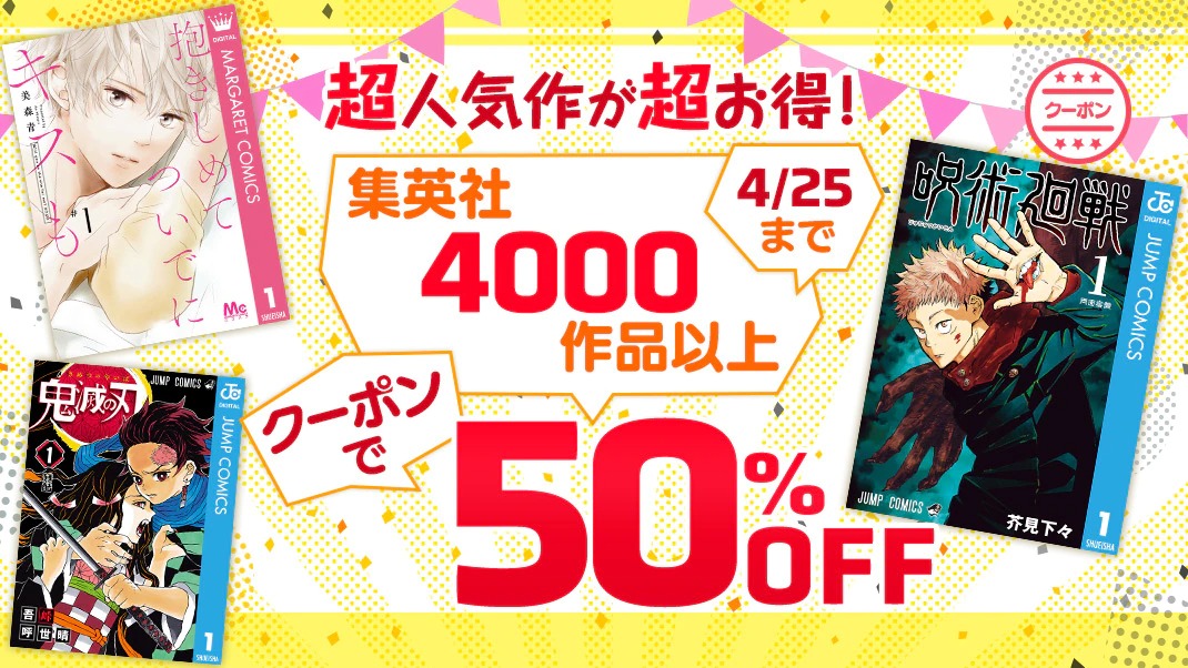 電子書籍ストアのebookjapanが、4月19日より集英社の作品を50%オフで購入できるクーポンの配布を開始しました。クーポンの獲得期間は4月25日23時59分まで。