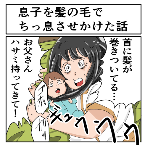 息子の首に髪が絡まり、その場で自分のロングヘアーを切り落としてもらった