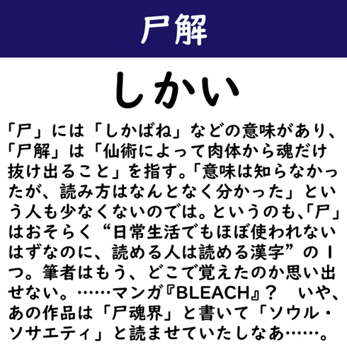 「尸」には「しかばね」などの意味があり、「尸解」は「仙術によって肉体から魂だけ抜け出ること」を指す。「意味は知らなかったが、読み方はなんとなく分かった」という人も少なくないのでは。というのも、「尸」はおそらく“日常生活でもほぼ使われないはずなのに、読める人は読める漢字”の1つ。筆者はもう、どこで覚えたのか思い出せない。……マンガ『BLEACH』? いや、あの作品は「尸魂界」と書いて「ソウル・ソサエティ」と読ませていたしなあ……。