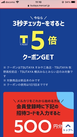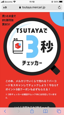 問題の店頭POPは、TSUTAYA店頭で販売されている新刊本がメルカリでいくらで売れるかチェックできるとして特設サイトに案内するもの。特設サイトでチェックすると、クーポンをゲットできるとうたっています。