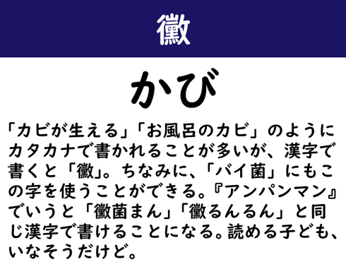 「カビが生える」「お風呂のカビ」のようにカタカナで書かれることが多いが、漢字で書くと「黴」。ちなみに、「バイ菌」にもこの字を使うことができる。『アンパンマン』でいうと「黴菌まん」「黴るんるん」と同じ漢字で書けることになる。読める子ども、いなそうだけど。