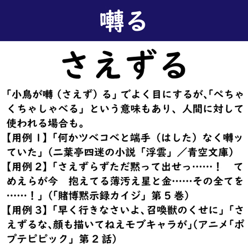 「小鳥が囀(さえず)る」でよく目にするが、「ぺちゃくちゃしゃべる」という意味もあり、人間に対して使われる場合も。【用例1】「何かツベコベと端手(はした)なく囀ッていた」(二葉亭四迷の小説「浮雲」/青空文庫)【用例2】「さえずらずただ黙って出せっ……! てめえらが今 抱えてる薄汚え星と金……その全てを……!」(「賭博黙示録カイジ」第5巻)【用例3】「早く行きなさいよ、召喚獣のくせに」「さえずるな、顔も描いてねえモブキャラが」(アニメ「ポプテピピック」第2話)