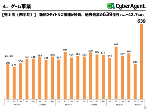 2021年度第2四半期のゲーム事業売上高は前年同期比42.7%増の639億円。