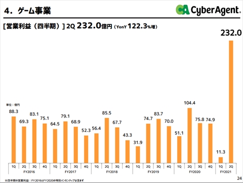 Cygamesやサムザップなどを含むゲーム事業の同四半期売上高は639億円。前年同期と比べると42.7%増となります。同社は新規2タイトル「ウマ娘」「NieR Re[in]carnation」の初速が好調だったとしています。ゲーム事業の営業利益は232億円で、前年同期比122.3%増。