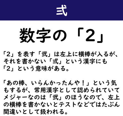 「2」を表す「弐」は左上に横棒が入るが、それを書かない「弍」という漢字にも「2」という意味がある。「あの棒、いらんかったんや!」という気もするが、常用漢字として認められていてメジャーなのは「弐」のほうなので、左上の横棒を書かないとテストなどではたぶん間違いとして扱われる。