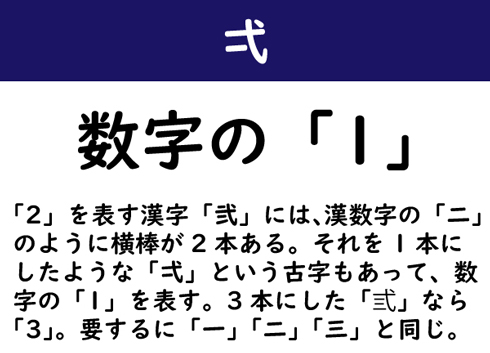 「2」を表す漢字「弐」には、漢数字の「二」のように横棒が2本ある。それを1本にしたような「弌」という古字もあって、数字の「1」を表す。3本にすると「3」を表す。要するに「一」「二」「三」と同じ。