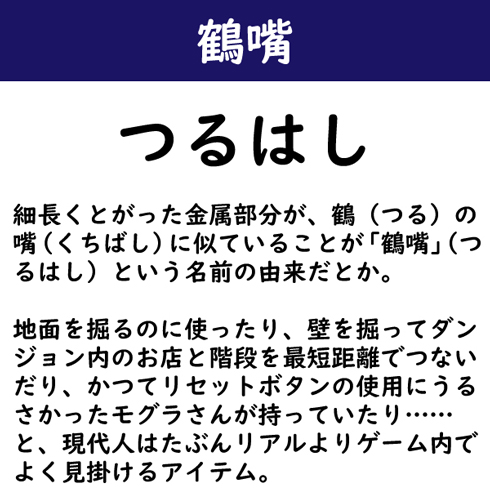 細長くとがった金属部分が、鶴(つる)の嘴(くちばし)に似ていることが「鶴嘴」(つるはし)という名前の由来だとか。地面を掘るのに使ったり、壁を掘ってダンジョン内のお店と階段を最短距離でつないだり、かつてリセットボタンの使用にうるさかったモグラさんが持っていたり……と、現代人はたぶんリアルよりゲーム内でよく見掛けるアイテム。