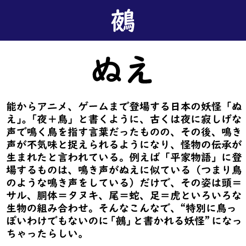 能からアニメ、ゲームまで登場する日本の妖怪「ぬえ」。「夜+鳥」と書くように、古くは夜に寂しげな声で鳴く鳥を指す言葉だったものの、その後、鳴き声が不気味と捉えられるようになり、怪物の伝承が生まれたと言われている。例えば「平家物語」に登場するものは、鳴き声がぬえに似ている(つまり鳥のような鳴き声をしている)だけで、その姿は頭=サル、胴体=タヌキ、尾=蛇、足=虎といろいろな生物の組み合わせ。そんなこんなで、“特別に鳥っぽいわけでもないのに「鵺」と書かれる妖怪”になっちゃったらしい。