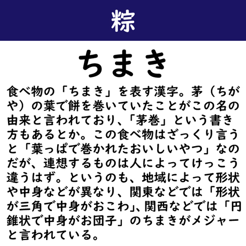 食べ物の「ちまき」を表す漢字。茅(ちがや)の葉で餅を巻いていたことがこの名の由来と言われており、「茅巻」という書き方もあるとか。この食べ物はざっくり言うと「葉っぱで巻かれたおいしいやつ」なのだが、連想するものは人によってけっこう違うはず。というのも、地域によって形状や中身などが異なり、関東などでは「形状が三角で中身がおこわ」、関西などでは「円錐状で中身がお団子」のちまきがメジャーと言われている。