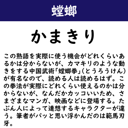 この熟語を実際に使う機会がどれくらいあるかは分からないが、カマキリのような動きをする中国武術「螳螂拳」(とうろうけん)が有名なので、読める人は読めるはず。この拳法が実際にどれくらい使えるのかは分からないが、なんだかカッコいいため、さまざまなマンガ、映画などに登場する。たぶん人によって連想するキャラクターが違う。筆者がパッと思い浮かんだのは範馬刃牙。