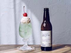無印良品のメロンソーダは、合成着色料を使用していないやわらかな緑が特徴。茶色の瓶に入った少しノスタルジックな見た目もすてきです。