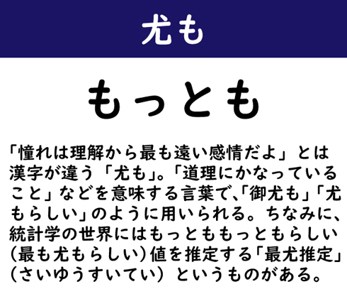 「憧れは理解から最も遠い感情だよ」とは漢字が違う「尤も」。「道理にかなっていること」などを意味する言葉で、「御尤も」「尤もらしい」のように用いられる。ちなみに、統計学の世界にはもっとももっともらしい(最も尤もらしい)値を推定する「最尤推定」(さいゆうすいてい)というものがある。