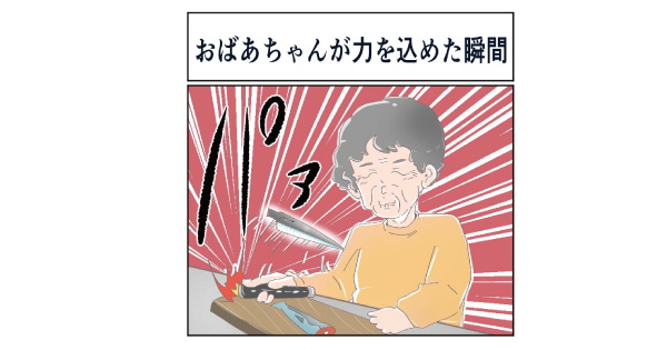 ある日、祖母と自分の2人で夕飯の支度をしていたときのこと。甘塩ホッケを焼こうとしていたのですが、祖母が「尾ビレだけ切り落とせばいいか」と魚用の小出刃包丁ではなく、別の包丁の刃を入れた瞬間、「プンッ」とギターの弦が切れたような音の直後、背後で「ガシャーン」という音が響きました。