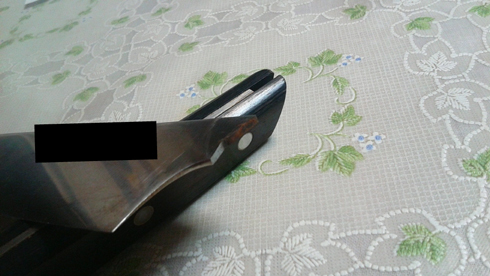 投稿者提供:このとき折れた包丁の写真。黒塗りの画像加工は、投稿者の意向に基づきメーカーロゴを隠したもの(この後、メーカー側もしっかり対応してくれたそうです)。現実問題として、メーカーにとっても消費者にとっても不良品は完全には避けられない問題だしなあ……