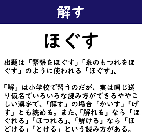 出題は「緊張をほぐす」「糸のもつれをほぐす」のように使われる「ほぐす」。「解」は小学校で習うのだが、実は同じ送り仮名でいろいろな読み方ができるややこしい漢字で、「解す」の場合「かいす」「げす」とも読める。また、「解れる」なら「ほぐれる」「ほつれる」、「解ける」なら「ほどける」「とける」という読み方がある。