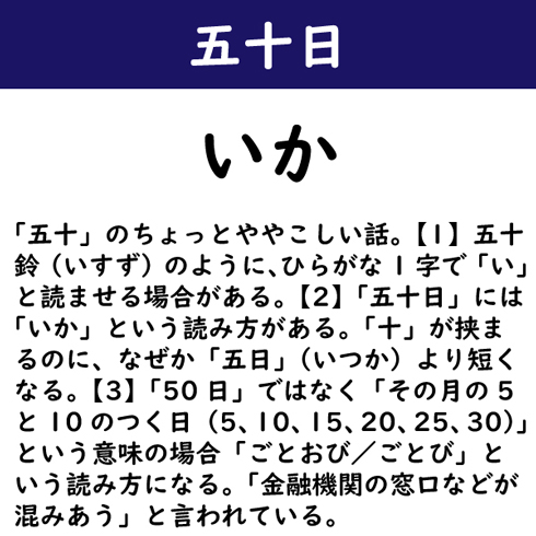 「五十」のちょっとややこしい話。【1】五十鈴(いすず)のように、ひらがな1字で「い」と読ませる場合がある。【2】「五十日」には「いか」という読み方がある。「十」が挟まるのに、なぜか「五日」(いつか)より短くなる。【3】「50日」ではなく「その月の5と10のつく日(5、10、15、20、25、30)」という意味の場合「ごとおび/ごとび」という読み方になる。「金融機関の窓口などが混みあう」と言われている。