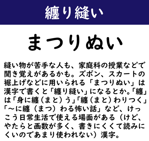 縫い物が苦手な人も、家庭科の授業などで聞き覚えがあるかも。ズボン、スカートの裾上げなどに用いられる「まつりぬい」は漢字で書くと「纏り縫い」になるとか。「纏」は「身に纏(まと)う」「纏(まと)わりつく」「〜に纏(まつ)わる怖い話」など、けっこう日常生活で使える場面がある(けど、やたらと画数が多く、書きにくくて読みにくいのであまり使われない)漢字。
