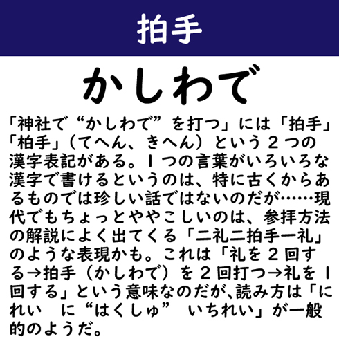 「神社で“かしわで”を打つ」には「拍手」「柏手」(てへん、きへん)という2つの漢字表記がある。1つの言葉がいろいろな漢字で書けるというのは、特に古くからあるものでは珍しい話ではないのだが……現代でもちょっとややこしいのは、参拝方法の解説によく出てくる「二礼二拍手一礼」のような表現かも。これは「礼を2回する→拍手(かしわで)を2回打つ→礼を1回する」という意味なのだが、読み方は「にれい に“はくしゅ” いちれい」が一般的のようだ。