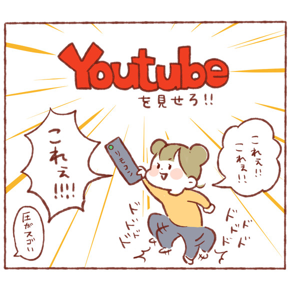リモコンを持ってYouTubeが見たいと要求する娘さん。ドドドドドと勢いよく足を踏み鳴らし、お母さんに圧をかけてきます。よほど大好きな動画があるのでしょうか?