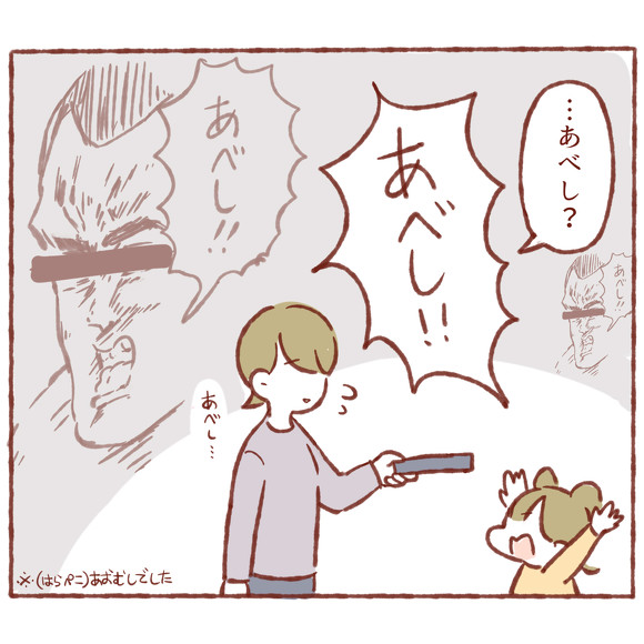 「子どもがしゃべれるようになったら楽に意志疎通できると思っていた」――。1歳8カ月の娘を持つ「おおみ(@ohmi_komemo)」さんは、言葉を覚えたての娘さんに困惑させられた一幕を漫画化しTwitterに投稿しました。あべし!