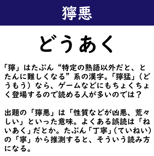 「獰」はたぶん“特定の熟語以外だと、とたんに難しくなる”系の漢字。「獰猛」(どうもう)なら、ゲームなどにもちょくちょく登場するので読める人が多いのでは? 出題の「獰悪」は「性質などが凶悪、荒々しい」といった意味。よくある誤読は「ねいあく」だとか。たぶん「丁寧」(ていねい)の「寧」から推測すると、そういう読み方になる。
