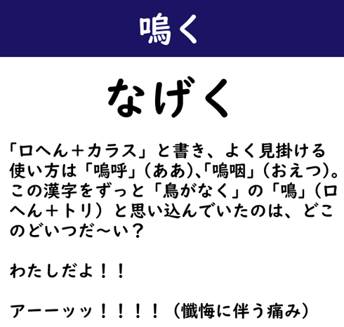 「口へん+カラス」と書き、よく見掛ける使い方は「嗚呼」(ああ)、「嗚咽」(おえつ)。この漢字をずっと「鳥がなく」の「鳴」(口へん+トリ)と思い込んでいたのは、どこのどいつだ〜い? わたしだよ!! アーーッッ!!!!(懺悔に伴う痛み)