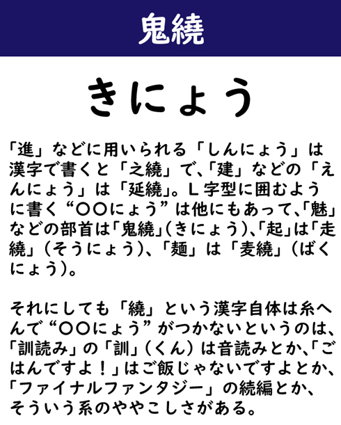 「進」などに用いられる「しんにょう」は漢字で書くと「之繞」で、「建」などの「えんにょう」は「延繞」。L字型に囲むように書く“〇〇にょう”は他にもあって、「魅」などの部首は「鬼繞」(きにょう)、「起」は「走繞」(そうにょう)、「麺」は「麦繞」(ばくにょう)。それにしても「繞」という漢字自体は糸へんで“〇〇にょう”がつかないというのは、「訓読み」の「訓」(くん)は音読みとか、「ごはんですよ!」はご飯じゃないですよとか、「ファイナルファンタジー」の続編とか、そういう系のややこしさがある。