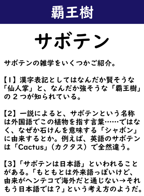 サボテンの雑学をいくつかご紹介。【1】漢字表記としてはなんだか賢そうな「仙人掌」と、なんだか強そうな「覇王樹」の2つが知られている。【2】一説によると、サボテンという名称は外国語でこの植物を指す言葉……ではなく、なぜか石けんを意味する「シャボン」に由来するとか。例えば、英語のサボテンは「Cactus」(カクタス)で全然違う。【3】「サボテンは日本語」といわれることがある。「もともとは外来語っぽいけど、由来がヘンテコで海外だと通じない→それもう日本語では?」という考え方のようだ。