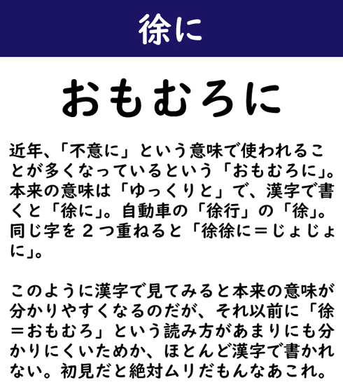 近年、「不意に」という意味で使われることが多くなっているという「おもむろに」。本来の意味は「ゆっくりと」で、漢字で書くと「徐に」。自動車の「徐行」の「徐」。同じ字を2つ重ねると「徐徐に=じょじょに」。このように漢字で見てみると本来の意味が分かりやすくなるのだが、それ以前に「徐=おもむろ」という読み方があまりにも分かりにくいためか、ほとんど漢字で書かれない。初見だと絶対ムリだもんなあこれ。