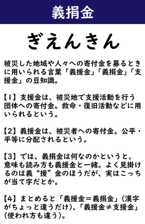 被災した地域や人々への寄付金を募るときに用いられる言葉「義援金」「義捐金」「支援金」の豆知識。【1】支援金は、被災地で支援活動を行う団体への寄付金。救命・復旧活動などに用いられるという。【2】義援金は、被災者への寄付金。公平・平等に分配されるという。【3】では、義捐金は何なのかというと、意味も読み方も義援金と一緒。よく見掛けるのは義“援”金のほうだが、実はこっちが当て字だとか。【4】まとめると「義援金=義捐金」(漢字がちょっと違うだけ)、「義援金≠支援金」(使われ方も違う)。