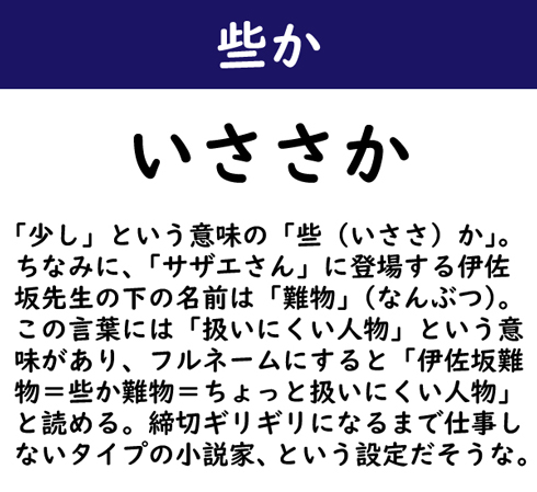 「少し」という意味の「些(いささ)か」。ちなみに、「サザエさん」に登場する伊佐坂先生の下の名前は「難物」(なんぶつ)。この言葉には「扱いにくい人物」という意味があり、フルネームにすると「伊佐坂難物=些か難物=ちょっと扱いにくい人物」と読める。締切ギリギリになるまで仕事しないタイプの小説家、という設定だそうな。