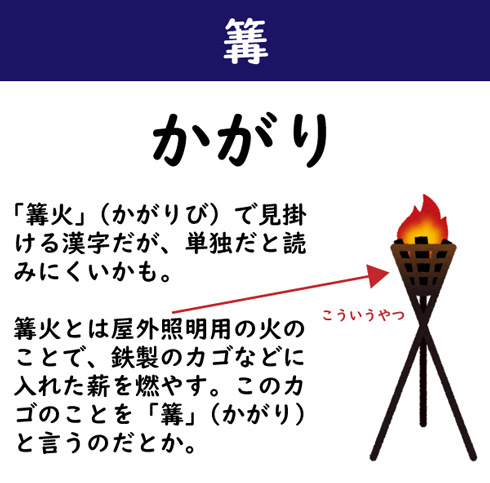 「篝火」(かがりび)で見掛ける漢字だが、単独だと読みにくいかも。篝火とは屋外照明用の火のことで、鉄製のカゴなどに入れた薪を燃やす。このカゴのことを「篝」(かがり)と言うのだとか。