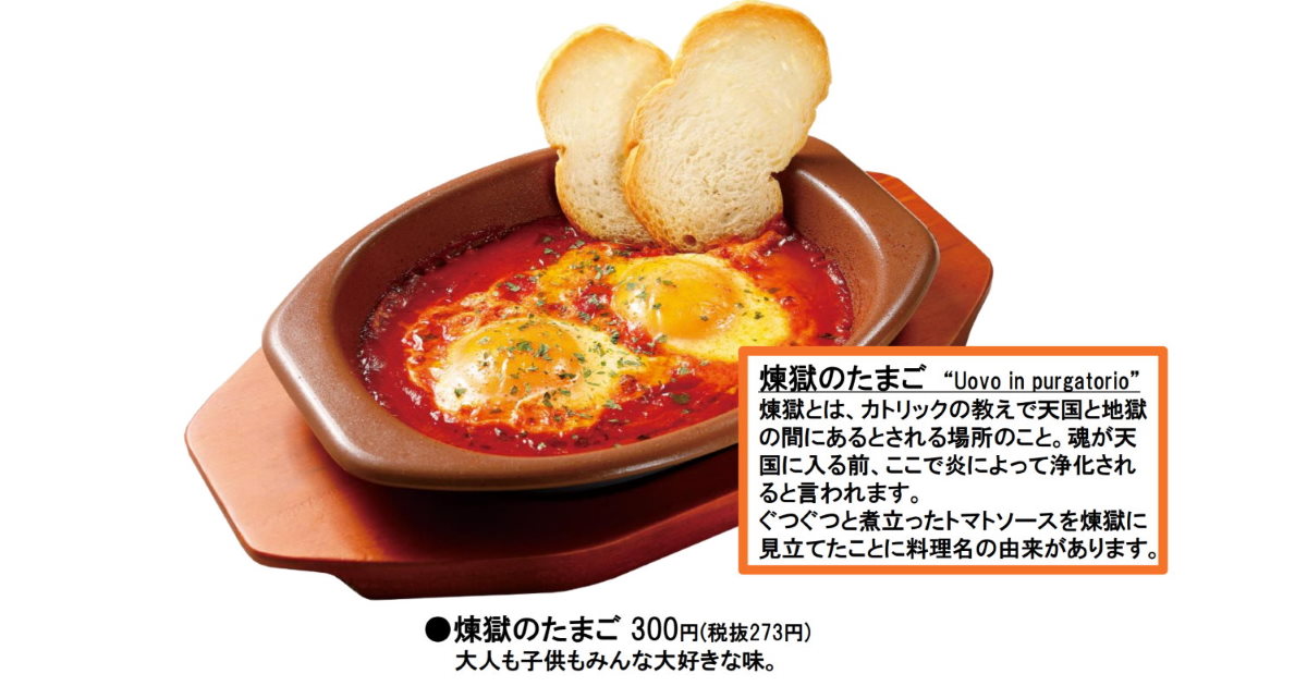 煉獄のたまごは、イタリアの家庭料理。グツグツと煮立ったトマトソースが、カトリックの教えにある天国と地獄の間にあるとされる場所「煉獄」に見立てて名付けられました。「鬼滅の刃」コラボメニューではなく、もともとそういう名前のイタリア料理です。価格は300円。