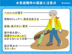 避難時の服装は用意があればヘルメットを着用しましょう。動きやすい長袖、長ズボン、履きなれたスニーカー(運動靴)で避難してください。おすすめは紐で締められ、靴底がしっかりしているタイプ。長靴は水が入ってしまうと歩行が困難になるため避けましょう。避難時に必要なものはリュックに入れて両手を空けておき、できれば軍手を着用してください。