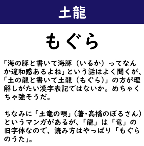 「海の豚と書いて海豚(いるか)ってなんか違和感あるよね」という話はよく聞くが、「土の龍と書いて土龍(もぐら)」の方が理解しがたい漢字表記ではないか。めちゃくちゃ強そうだ。ちなみに「土竜の唄」(著・高橋のぼるさん)というマンガがあるが、「龍」は「竜」の旧字体なので、読み方はやっぱり「もぐらのうた」。