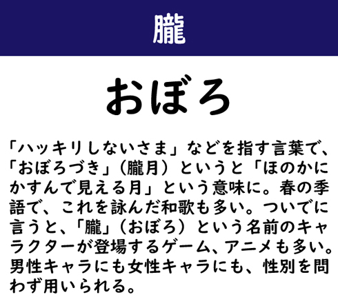 「ハッキリしないさま」などを指す言葉で、「おぼろづき」(朧月)というと「ほのかにかすんで見える月」という意味に。春の季語で、これを詠んだ和歌も多い。ついでに言うと、「朧」(おぼろ)という名前のキャラクターが登場するゲーム、アニメも多い。男性キャラにも女性キャラにも、性別を問わず用いられる。