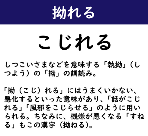 しつこいさまなどを意味する「執拗」(しつよう)の「拗」の訓読み。「拗(こじ)れる」にはうまくいかない、悪化するといった意味があり、「話がこじれる」「風邪をこじらせる」のように用いられる。ちなみに、機嫌が悪くなる「すねる」もこの漢字(拗ねる)。