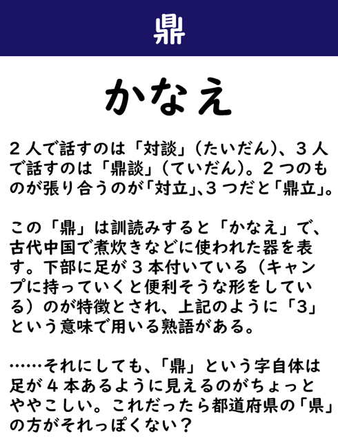 2人で話すのは「対談」(たいだん)、3人で話すのは「鼎談」(ていだん)。2つのものが張り合うのが「対立」、3つだと「鼎立」。この「鼎」は訓読みすると「かなえ」で、古代中国で煮炊きなどに使われた器を表す。下部に足が3本付いている(キャンプに持っていくと便利そうな形をしている)のが特徴とされ、上記のように「3」という意味で用いる熟語がある。……それにしても、「鼎」という字自体は足が4本あるように見えるのがちょっとややこしい。これだったら都道府県の「県」の方がそれっぽくない?