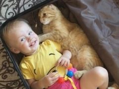カメラが近づくと、赤ちゃんがニコッと笑いとてもリラックスしているようす。猫ちゃんになにやら話しかけている姿からは、2人がとても仲良しだということが伝わってきます。スーツケースの中では内緒話が弾みそうですね。