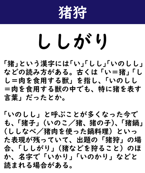 「猪」という漢字には「い」「しし」「いのしし」などの読み方がある。古くは「い=猪」「しし=肉を食用する獣」を指し、「いのしし=肉を食用する獣の中でも、特に猪を表す言葉」だったとか。「いのしし」と呼ぶことが多くなった今でも、「猪子」(いのこ/猪、猪の子)、「猪鍋」(ししなべ/猪肉を使った鍋料理)といった表現が残っていて、出題の「猪狩」の場合、「ししがり」(猪などを狩ること)のほか、名字で「いかり」「いのかり」などと読まれる場合がある。